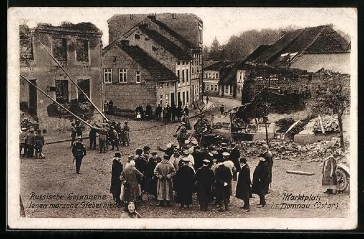 AK Domnau, Russische Gefangene legen morsche Giebel nieder