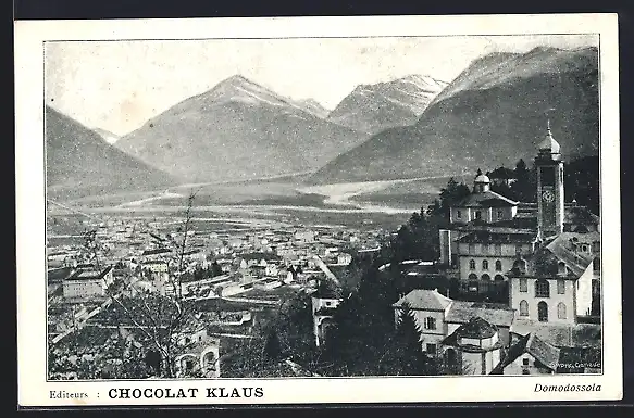 AK Domodossola, Totalansicht mit Turmgebäude u. Bergpanorama aus der Vogelschau