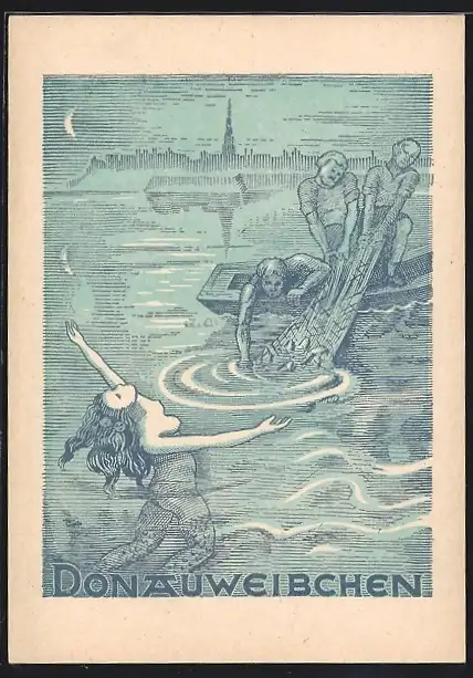 AK Donauweibchen vor den Fischern die ihr Netz herausholen, Zeichnung v. R. Schmid