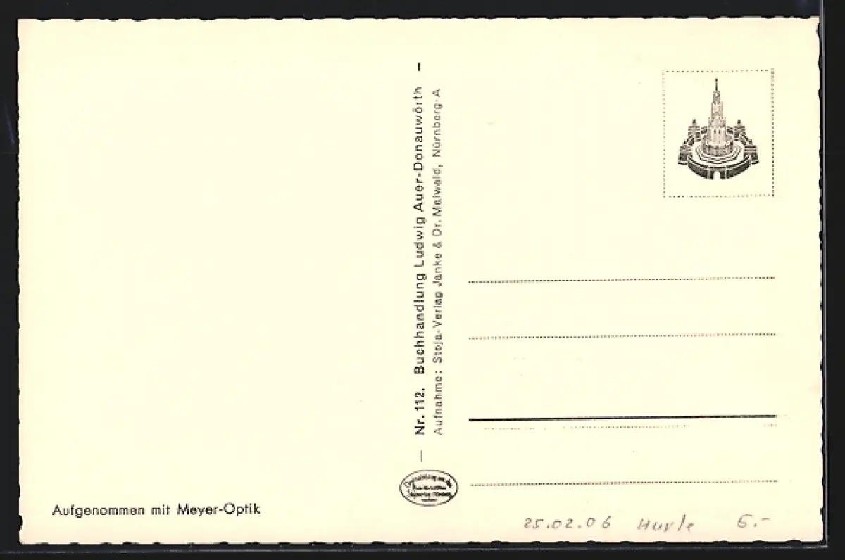Personenbezogene Daten auf der Rückseite der Karte wurden durch blauen Textmarker unkenntlich gemacht. Die blauen Stellen sind auf die Vorderseite durchgeweicht und wirken sich negativ auf das Postkartenfoto aus