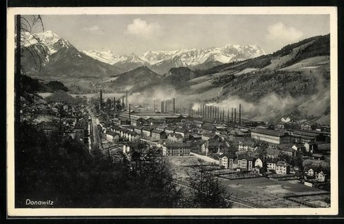 AK Donawitz, Ortsansicht mit Fabriken und Bahnschienen