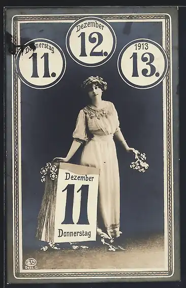AK Donnerstag 11. Dezember 1913, junges Mädchen neben einem Kalender stehend