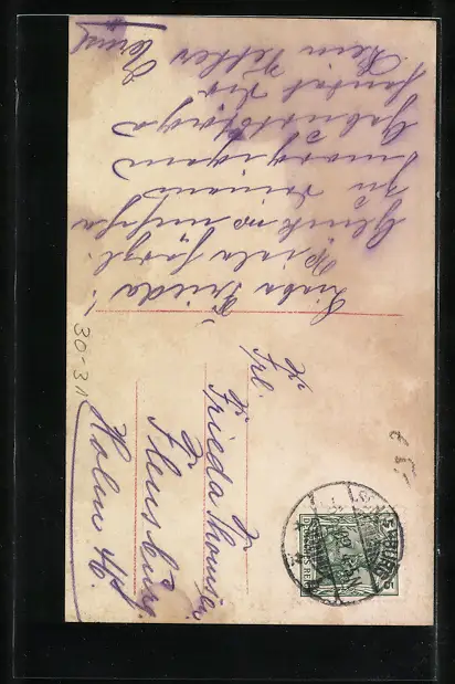 Personenbezogene Daten auf der Rückseite der Karte wurden durch blauen Textmarker unkenntlich gemacht. Die blauen Stellen sind auf die Vorderseite durchgeweicht und wirken sich negativ auf das Postkartenfoto aus