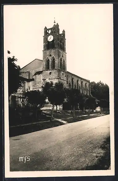 AK Donzac, Église avec clocher et horloge sur la rue principale