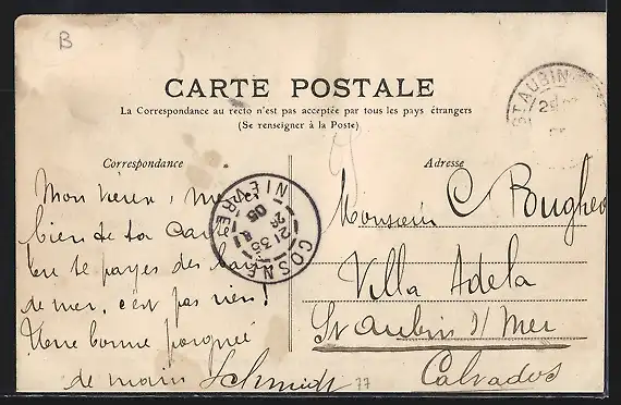 Personenbezogene Daten auf der Rückseite der Karte wurden durch blauen Textmarker unkenntlich gemacht. Die blauen Stellen sind auf die Vorderseite durchgeweicht und wirken sich negativ auf das Postkartenfoto aus