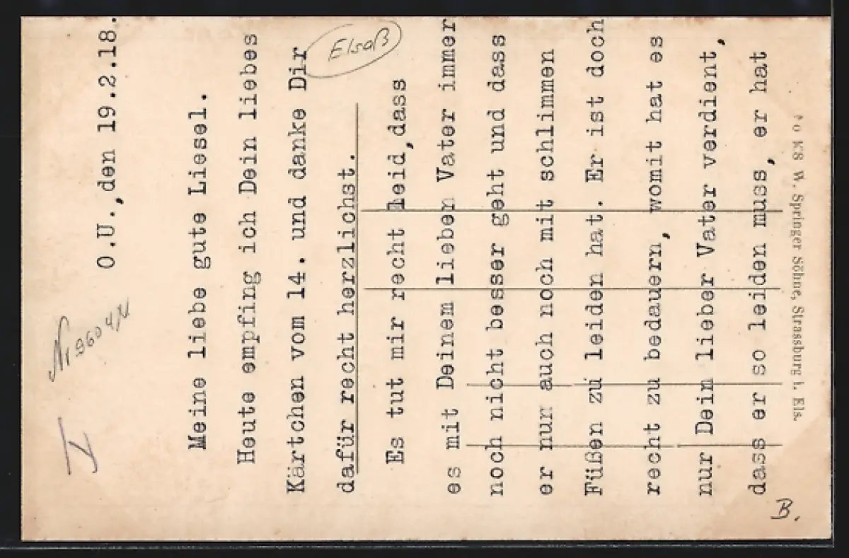 Personenbezogene Daten auf der Rückseite der Karte wurden durch blauen Textmarker unkenntlich gemacht. Die blauen Stellen sind auf die Vorderseite durchgeweicht und wirken sich negativ auf das Postkartenfoto aus