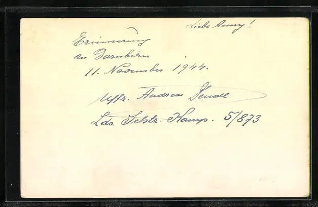 Personenbezogene Daten auf der Rückseite der Karte wurden durch blauen Textmarker unkenntlich gemacht. Die blauen Stellen sind auf die Vorderseite durchgeweicht und wirken sich negativ auf das Postkartenfoto aus