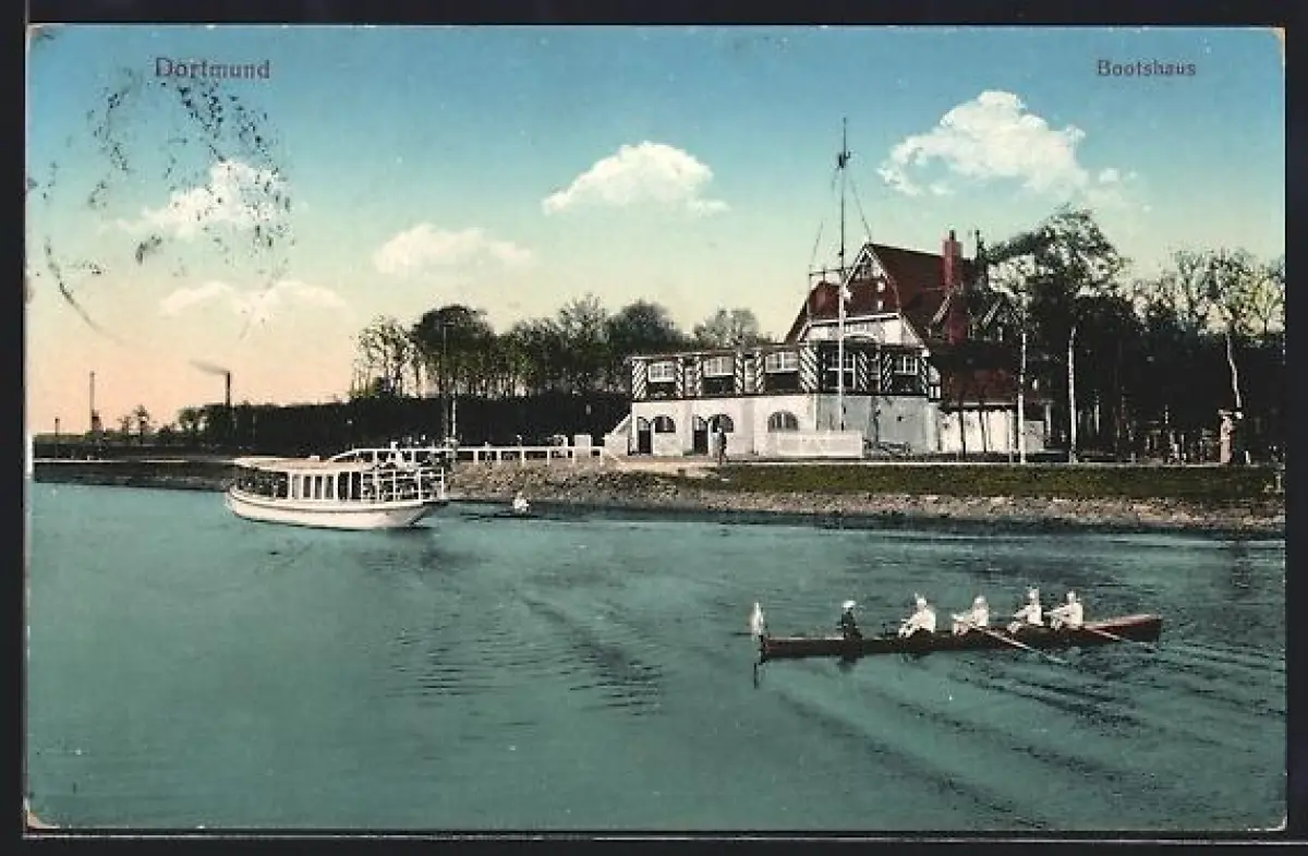 AK Dortmund, Ansicht vom Bootshaus, im Vordergrund Viererruderer