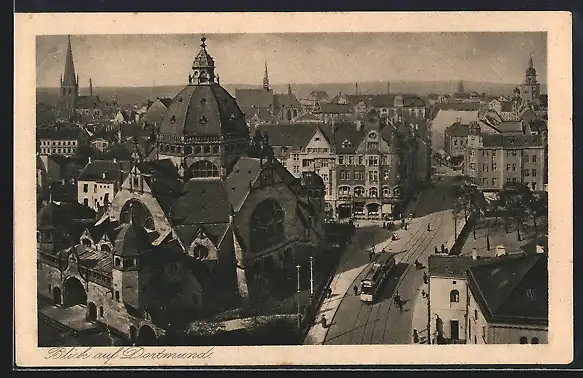 AK Dortmund, Teilansicht mit Synagoge, Strassenbahn