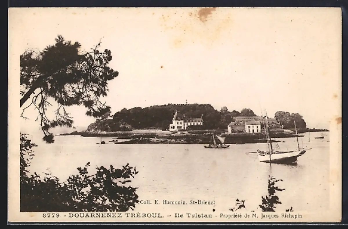 AK Douarnenez Tréboul, Ile Tristan, vue sur l`île et les voiliers dans la baie