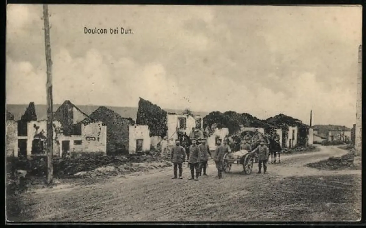 AK Doulcon /Dun, Rue avec soldats et charrette dans le village en ruines