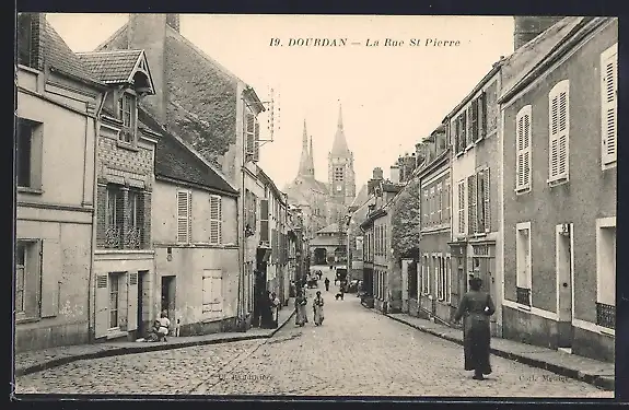 AK Dourdan, La Rue St Pierre avec vue sur l`église en arrière-plan
