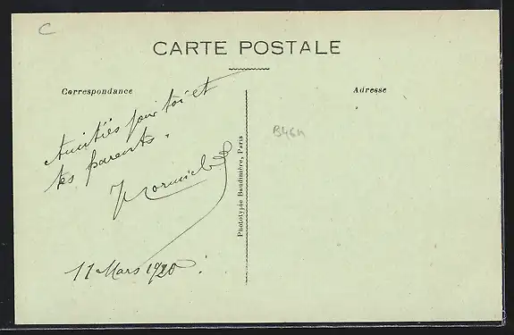 Personenbezogene Daten auf der Rückseite der Karte wurden durch blauen Textmarker unkenntlich gemacht. Die blauen Stellen sind auf die Vorderseite durchgeweicht und wirken sich negativ auf das Postkartenfoto aus