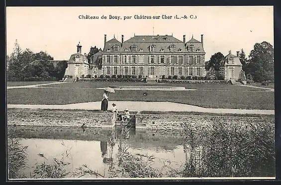 AK Douy, Château et jardin avec promeneurs au bord de l`eau