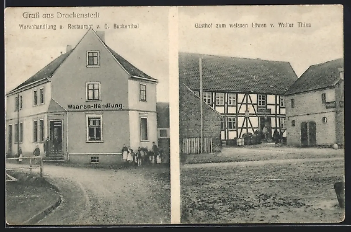 AK Drackenstedt, Warenhandlung u. Restaurant v. O. Buckenthal, Gasthof zum weissen Löwen v. Walter Thies