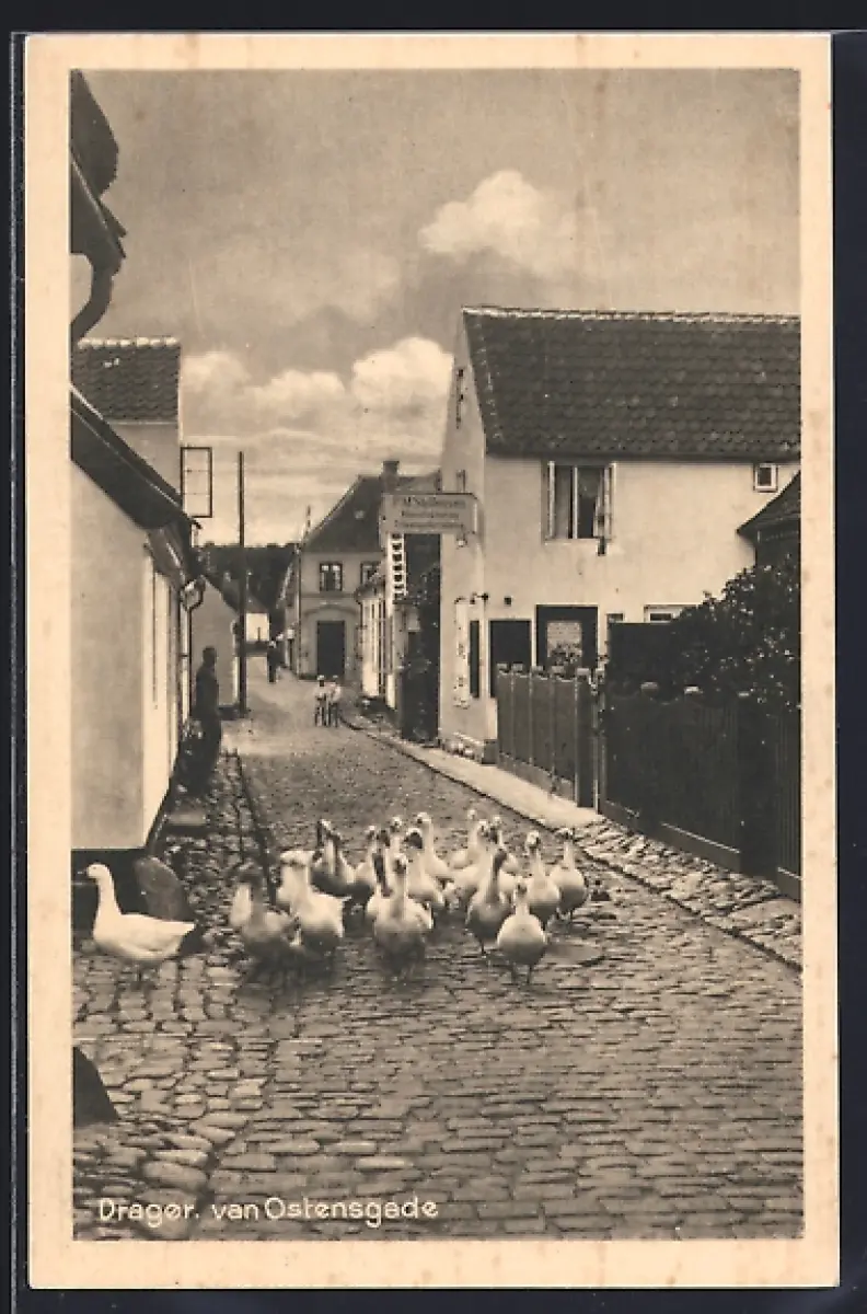 AK Dragor, Van Ostensgade, Strassenpartie mit Gänsen