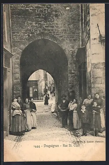 AK Draguignan, Rue St. Clair avec habitants devant un portail en pierre