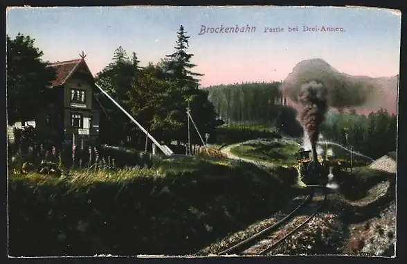 AK Drei-Annen /Harz, Gebäudeansicht mit fahrender Brockenbahn