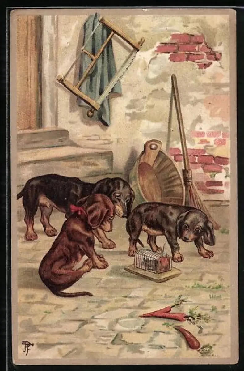 AK Drei Dackel beäugen eine Maus in der Falle auf einem Gehöft
