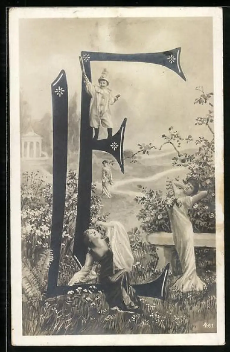 AK Drei Frauen mit kleinem Harlekin an den Buchstaben L & F
