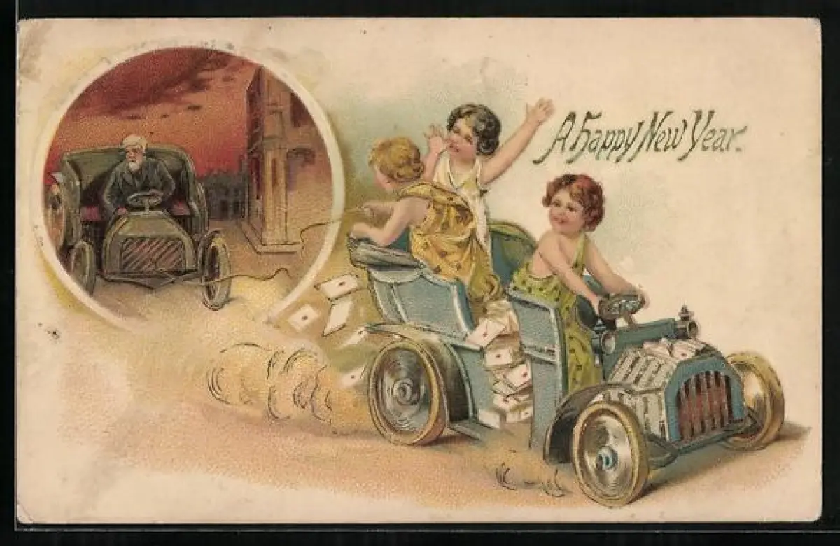 AK Drei Kinder fahren im Auto, am Seil ein Mann im Auto