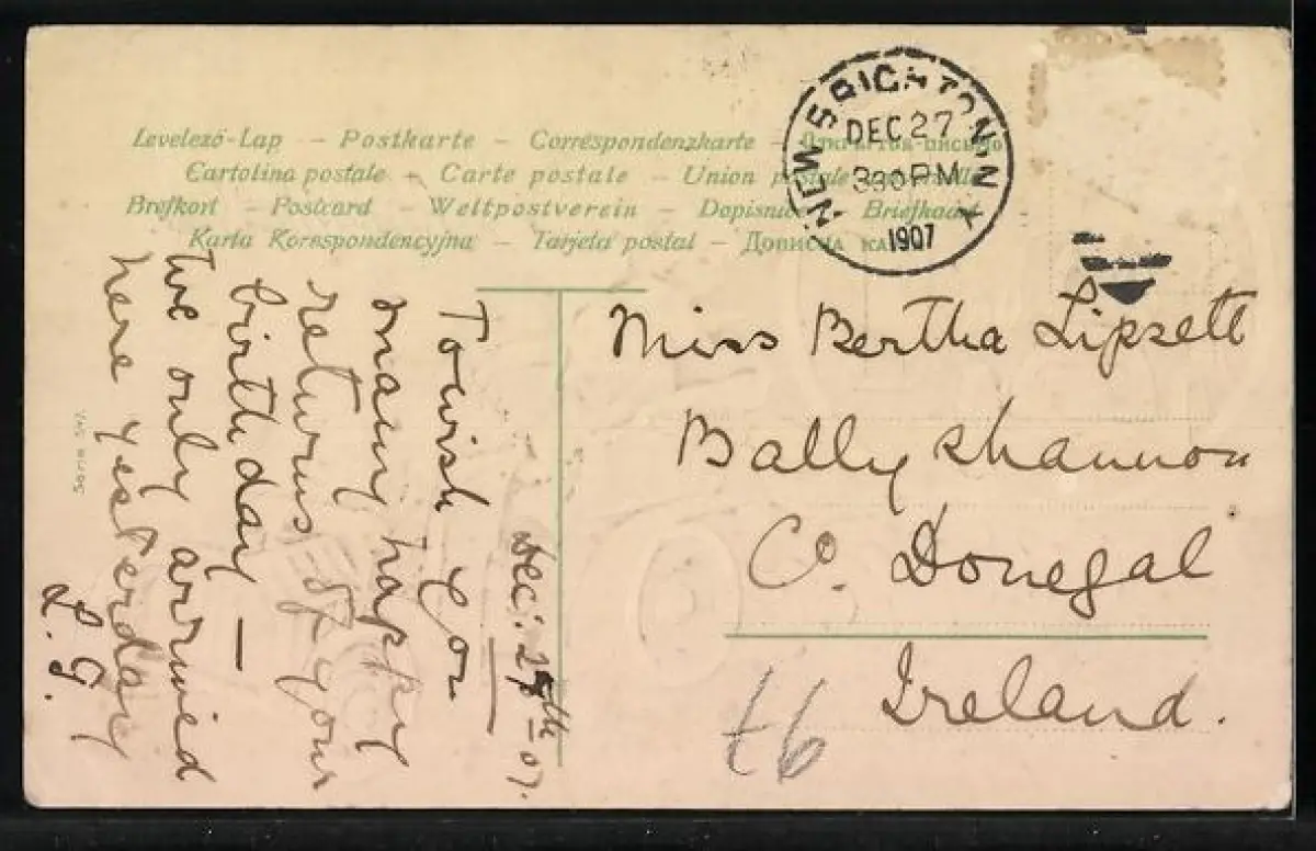 gelaufen 1907, Briefmarke entfernt, guter Zustand