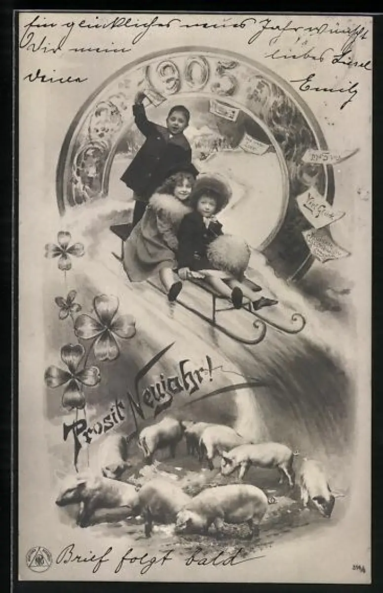 AK Drei Kinder mit Schlitten und Ferkeln, Neujahrsgruss 1905