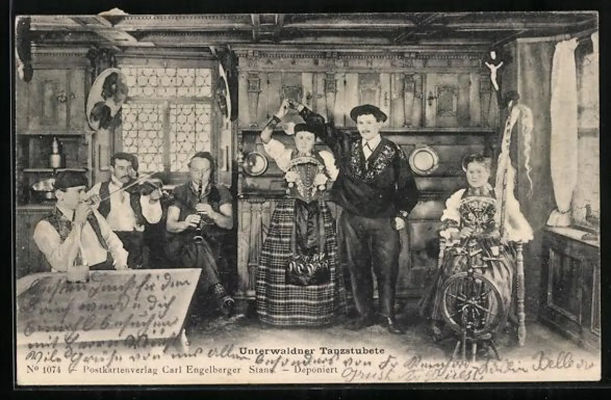 AK Drei Musiker, ein Tanzpaar und eine Frau am Spinnrad in Unterwaldner Trachten