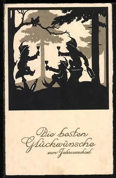 AK Drei Zwerge feiern im Wald, Neujahr