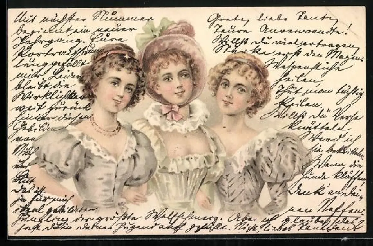 AK Drei junge Damen in festlicher Bekleidung, Jugendstil