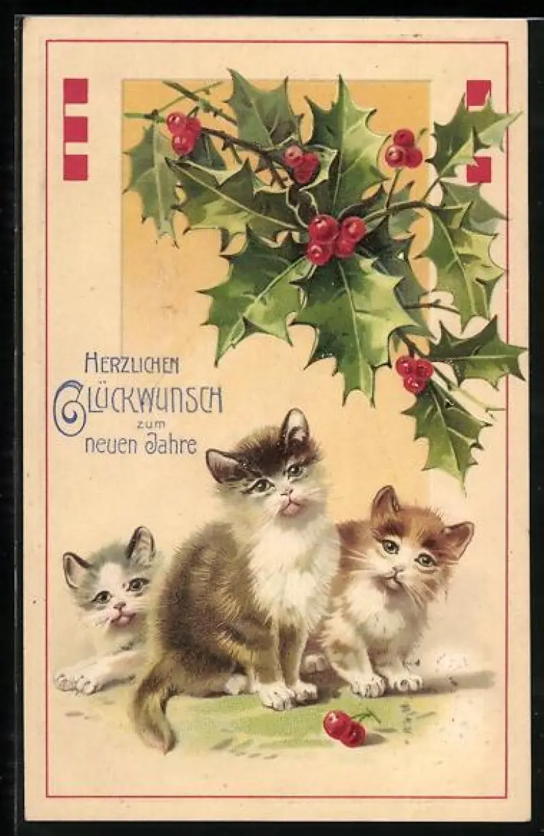 AK Drei kleine Katzen mit Mistelzweig, Neujahrsgruss