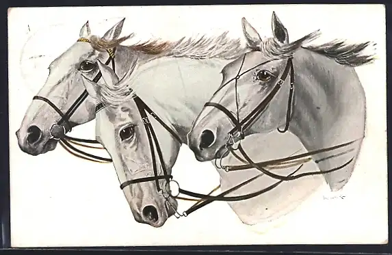 AK Drei weisse Pferde mit Geschirr von der Seite