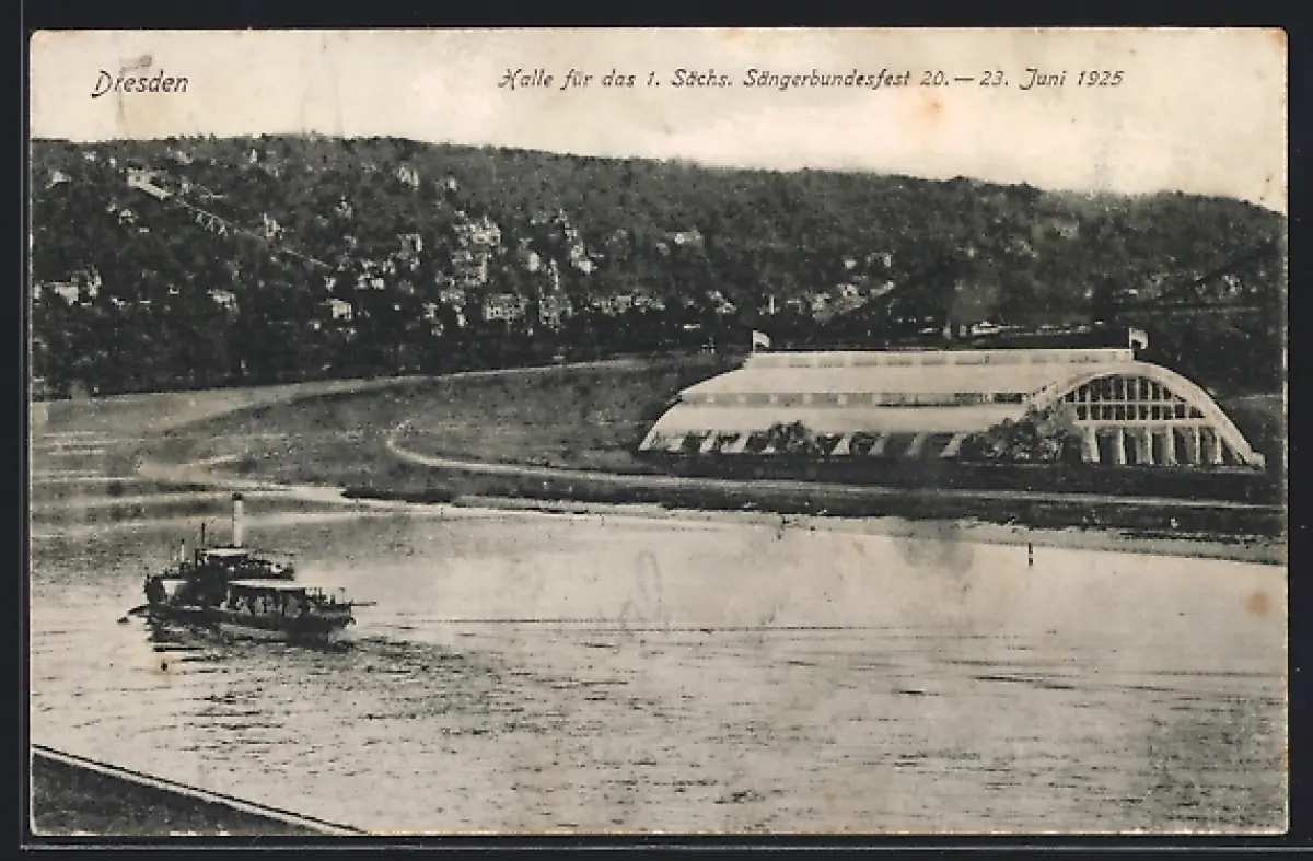 AK Dresden, 1. Sächs. Sängerbundesfest 1925, Elbpartie mit Halle