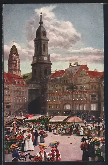 AK Dresden, Altmarkt mit Blumenmarkt, Kreuzkirche & Rathausturm
