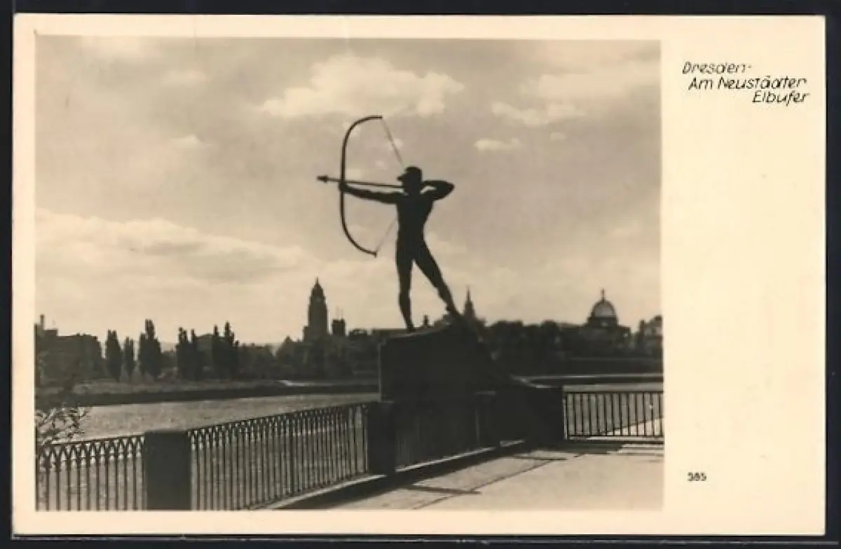 AK Dresden, Am Neustädter Elbufer, Bogenschütze-Skulptur