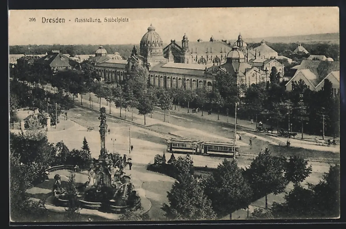 AK Dresden, Ausstellung, Stübelplatz mit Strassenbahn