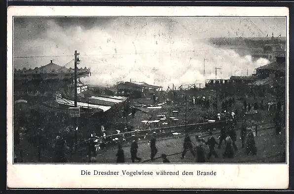 AK Dresden, Die Dresdener Vogelwiese während dem Brande