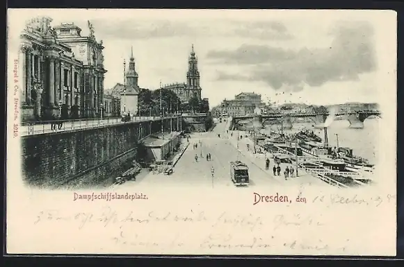 AK Dresden, Elbpartie am Dampfschiffslandeplatz und Strassenbahn