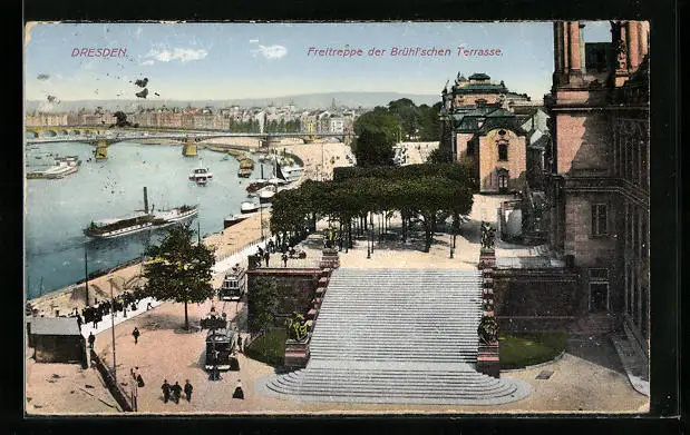 AK Dresden, Freitreppe der Brühl`schen Terrasse, Strassenbahn