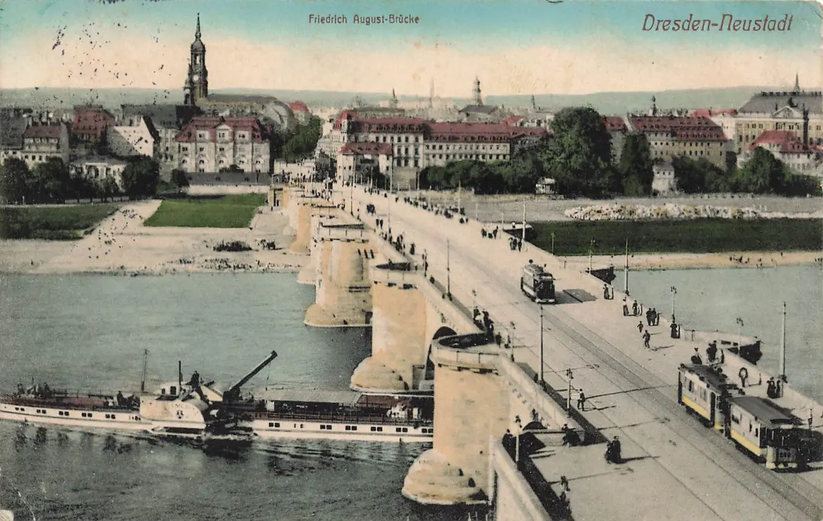 AK Dresden Friedrich August Brücke Straßenbahn Sachsen 1914 gelaufen Postkarte