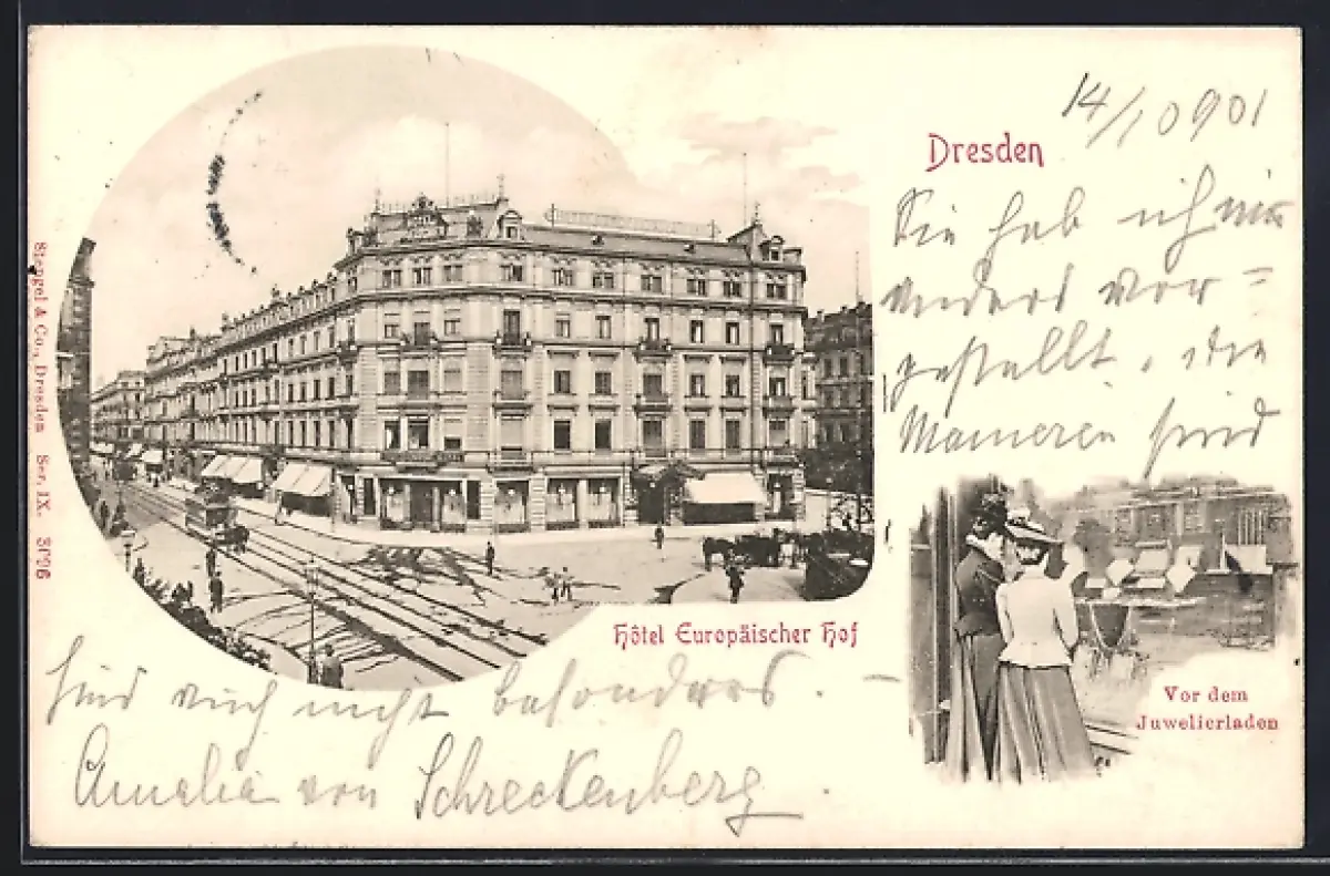 AK Dresden, Hotel Europäischer Hof, Zwei Damen vor dem Juwelierladen