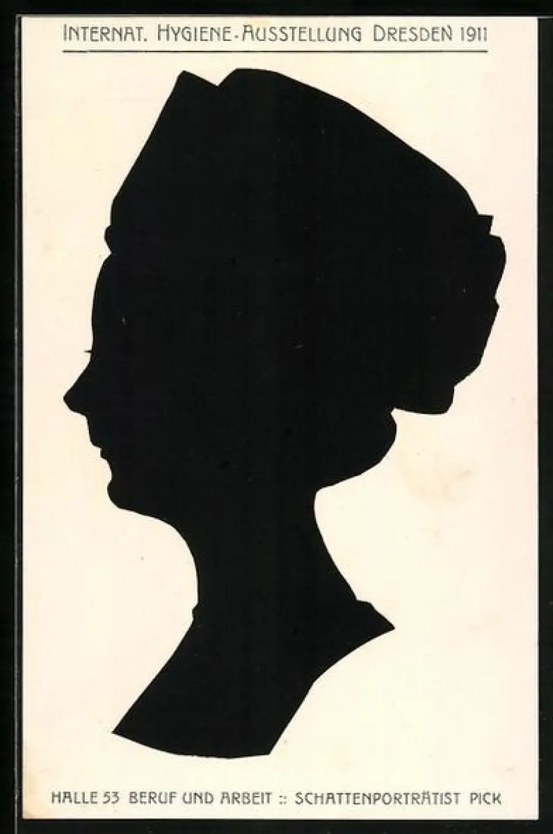 AK Dresden, Hygiene-Ausstellung, Scherenschnitt einer jungen Dame mit Kopfbedeckung, Schattenporträtist Pick