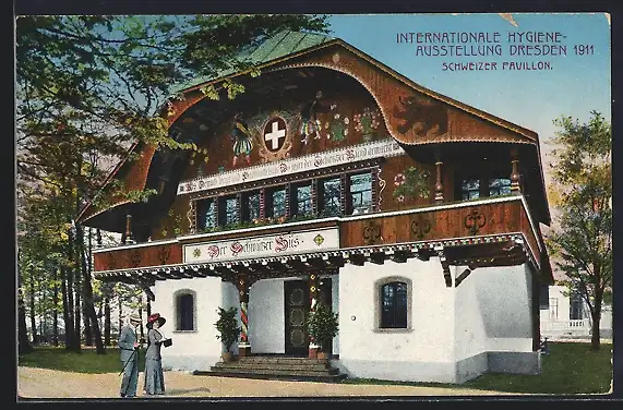 AK Dresden, Internationale Hygiene-Ausstellung 1911, Schweizer Pavillon, Spaziergänger