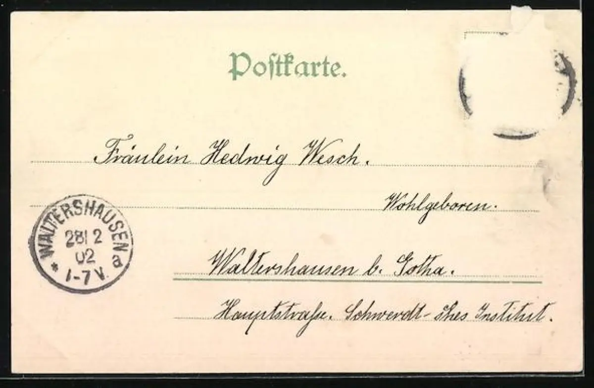 alte Ansichtskarte, gelaufen 1902, Briefmarke entfernt, rückseitig Oberflächenschaden, guter Zustand