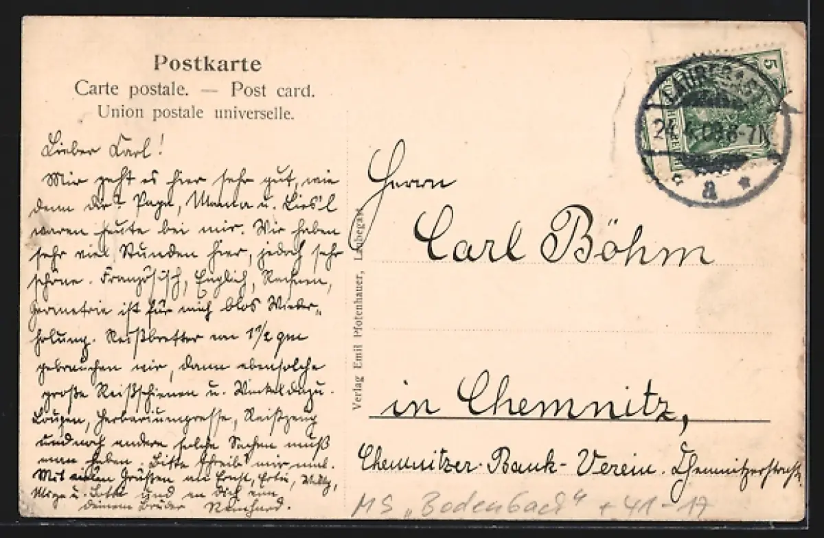 gelaufen 1909, Eckknick re. unten, Bugspur li. oben, guter Zustand