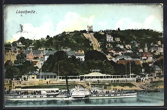 AK Dresden-Loschwitz, Blick zur Berg-Schwebebahn, Dampfer Leitmeritz auf der Elbe