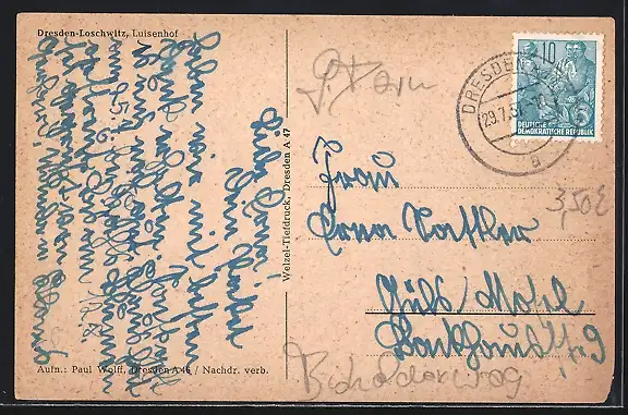 alte Ansichtskarte, gelaufen 1957, Einriss unten re., Randschaden li. unten, guter Zustand