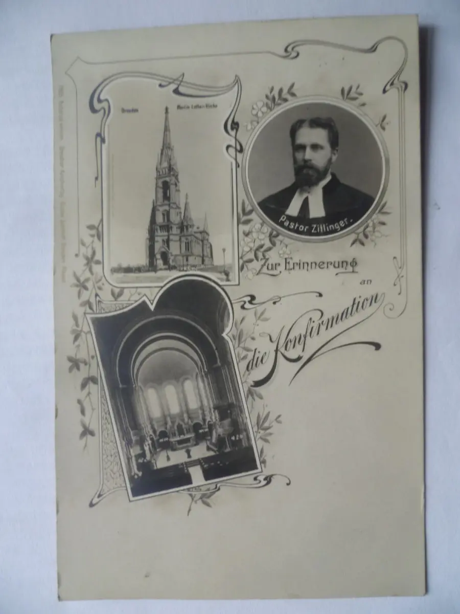 Erinnerungskarte zur Konfirmation als Fotomontage, Dresdner Kunstverlag Gustav Schmidt Dresden-Plauen 1905. Mit Außen- und Innenansicht der Kirche und einem Porträt von Pastor Zillinger. Ungelaufen, rückseitig etwas gebräunt. Die Größe lässt vermuten, dass die Karte minimal beschnitten wurde.
