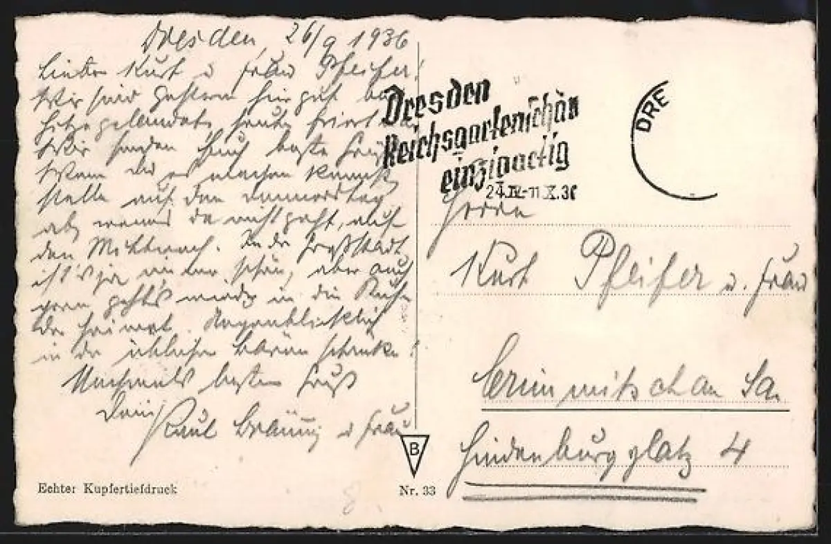 gelaufen 1936, Stempelspur, Briefmarke entfernt, guter Zustand