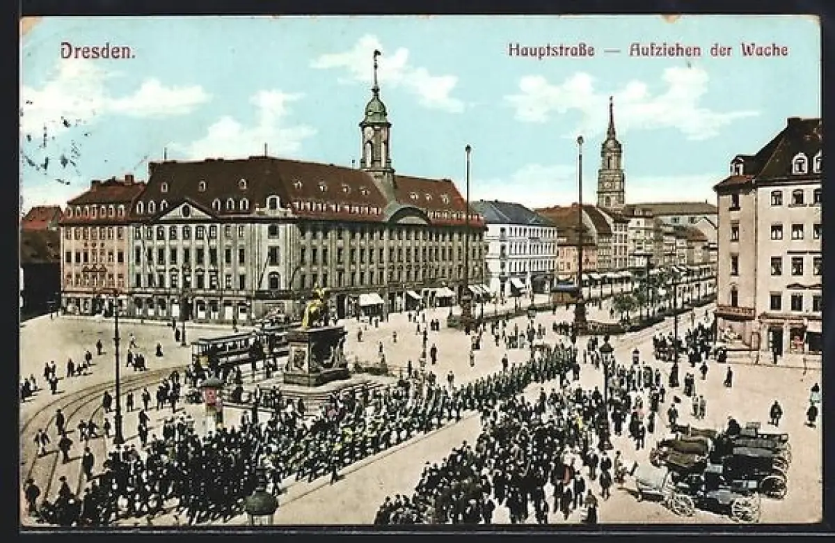 AK Dresden-Neustadt, Hauptstrasse, Aufziehen der Wache, Strassenbahn
